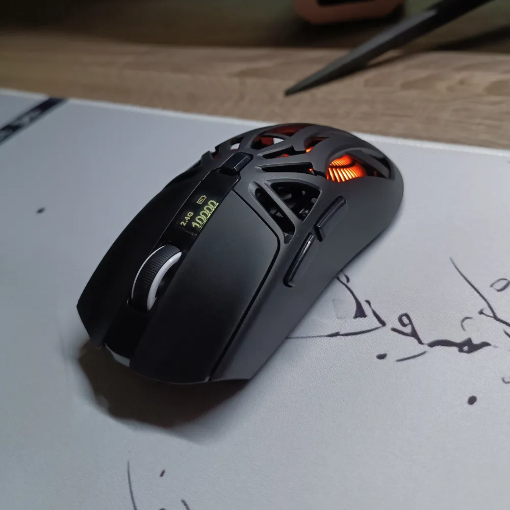 Its integrated mini display keeps you informed in real time — showing DPI level, connection mode, and battery status at a glance.